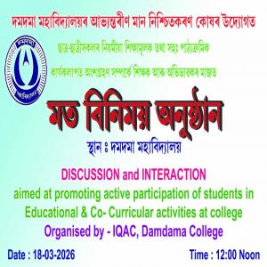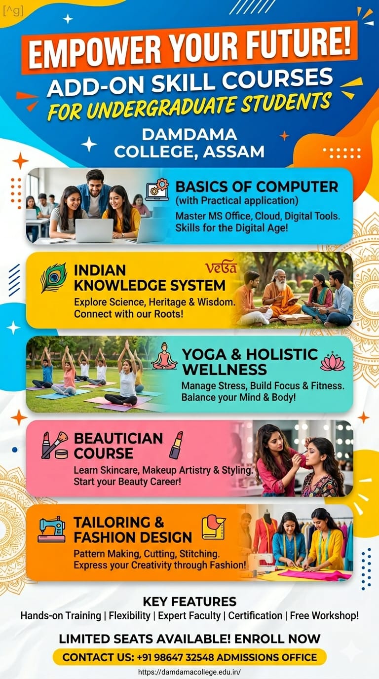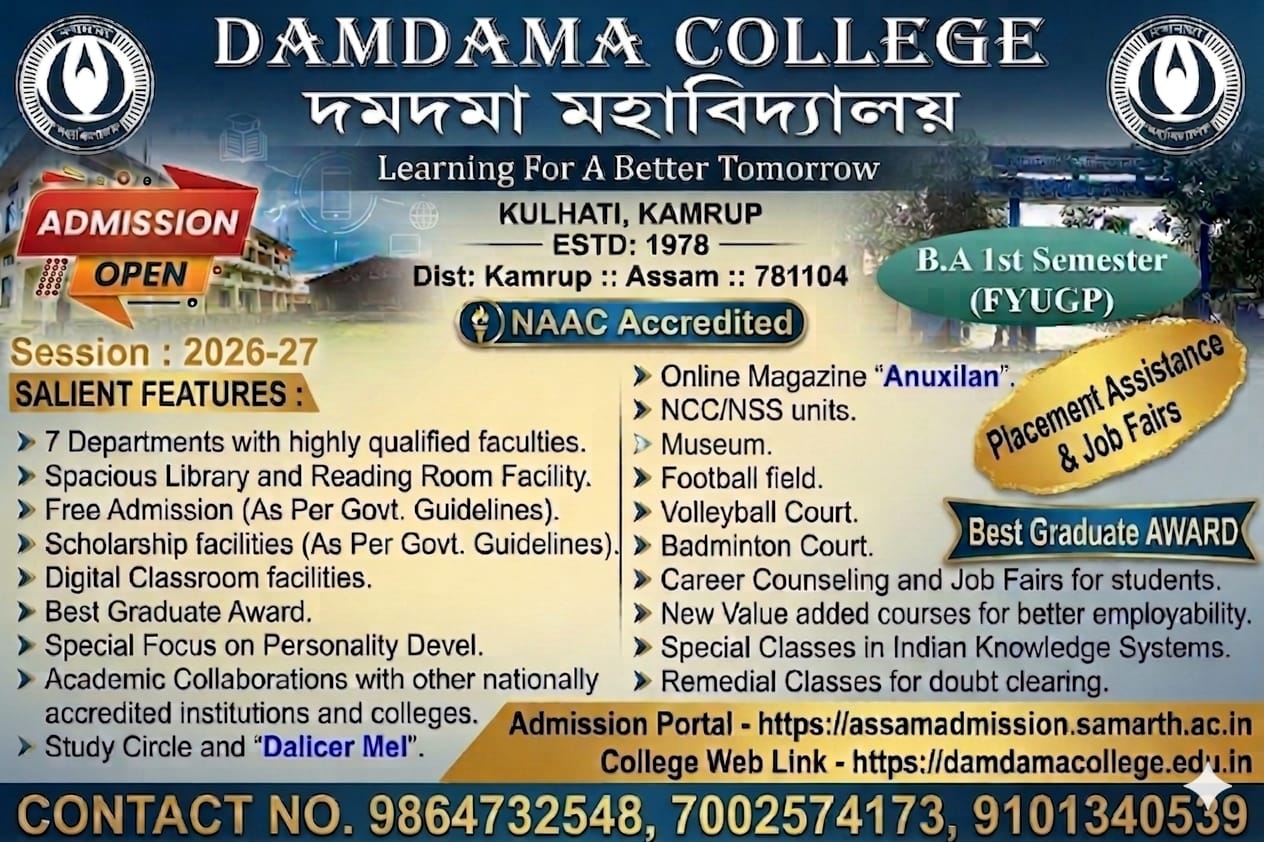 Damdama College, P.O.- Kulhati, Kamrup, Assam was established on 9th August 1978 with the motto ‘Imparting Higher Education’ to the rural youth of the locality. It is known that education is acquisition of knowledge and knowledge always wins. Here knowledge does not connote to mere accumulation of facts and information; rather it must add to the creative faculty and original thinking and gradually bring about a positive transformation in one’s personality, thus preparing the students...